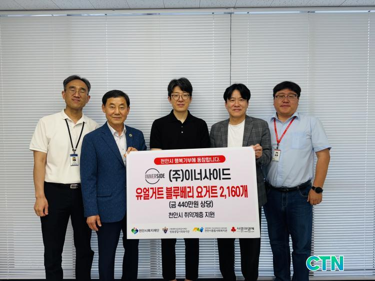 [사회/CTN]강현수 기자 = ㈜이너사이드(대표 이호중)는 천안시 취약계층 지원을 위해 22일 블루베리 요거트 2,160개(440만 원 상당)를 후원했다. 이는 지역 내 사회복지시설과 행정복지센터를 통해 사례관리 대상자 및 저소득층에 배부될 예정이다.