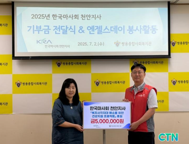 [천안/CTN] 강현수 기자 = 한국마사회 천안지사(지사장 정태인)는 지난 7월 2일(화), 천안시 쌍용동에 위치한 쌍용종합사회복지관을 방문해 복지사각지대 가정을 위한 후원금 500만 원을 기부했다고 밝혔다.