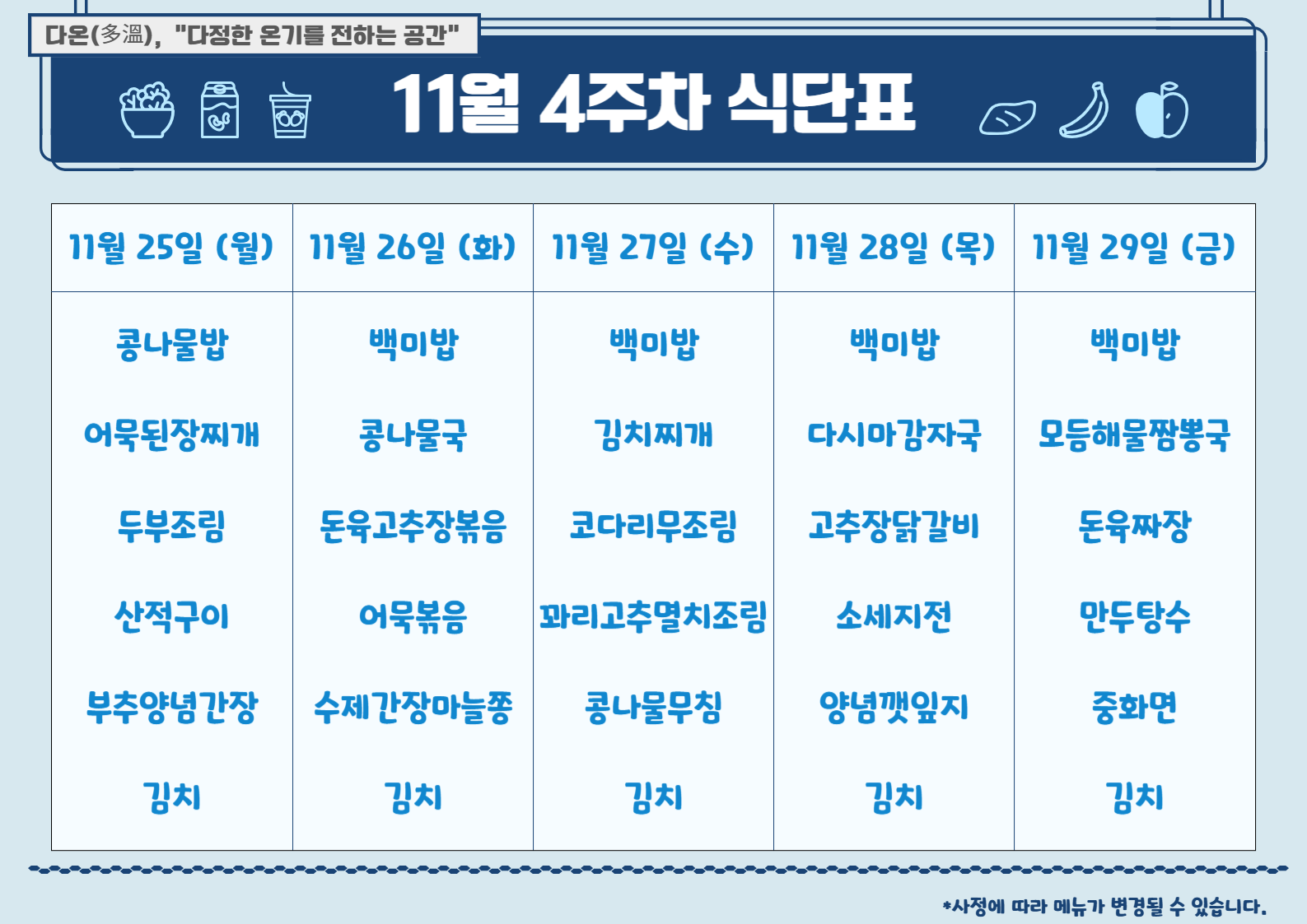 ๐Ÿด11์›” 4์ฃผ์ฐจ ์‹๋‹จํ‘œ๐Ÿด